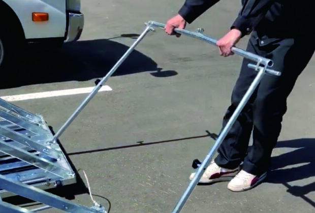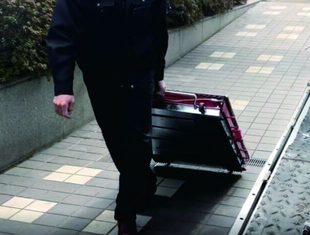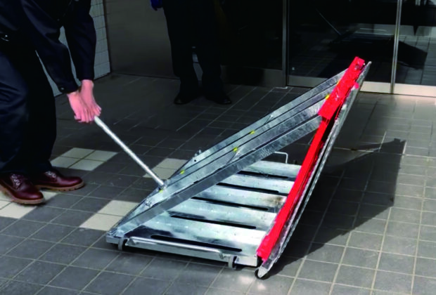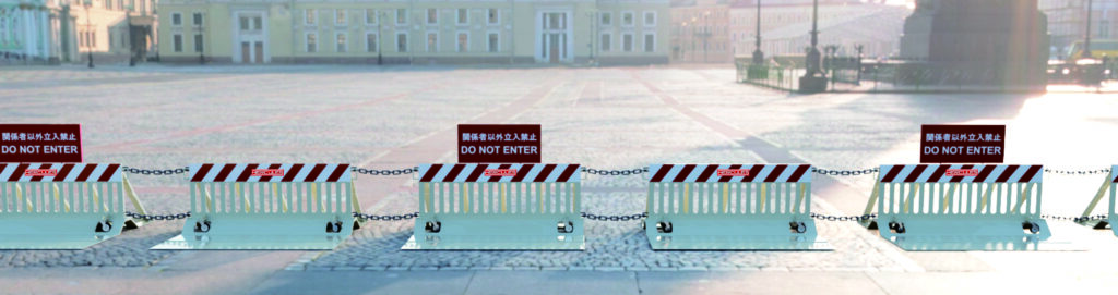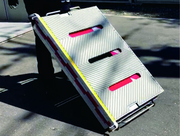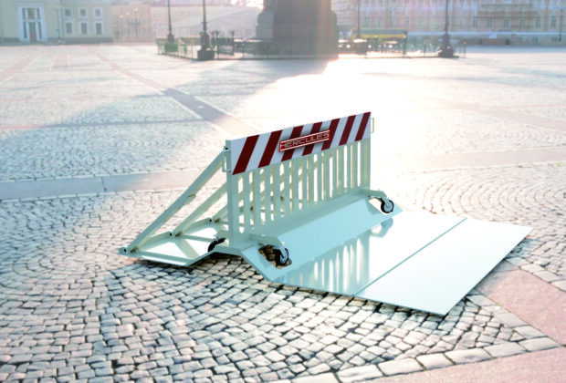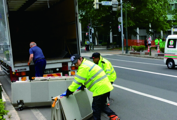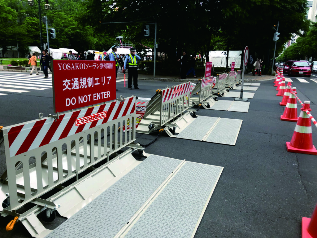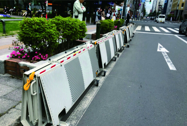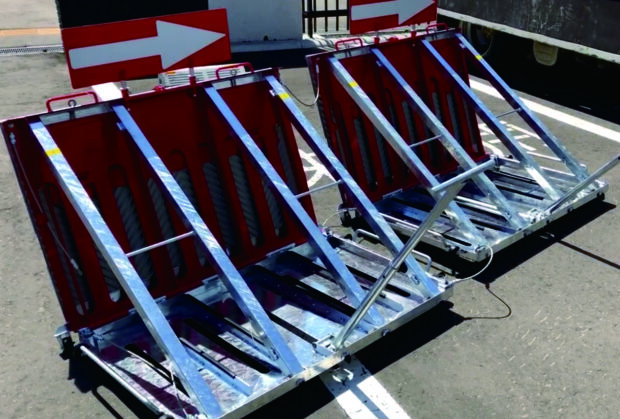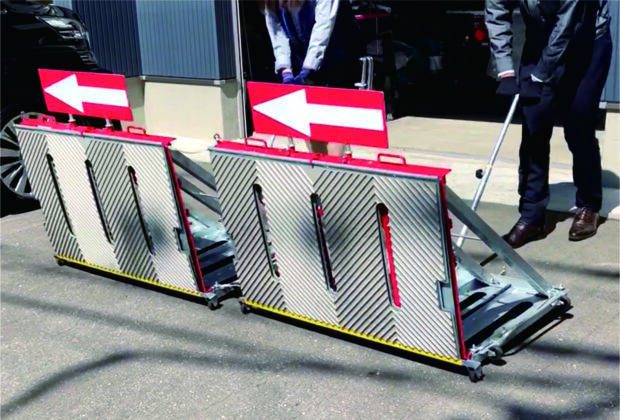 折り畳み収納式/移動キャスター付き ●設置・撤収が容易●緊急車両が通行する際も移動が可能