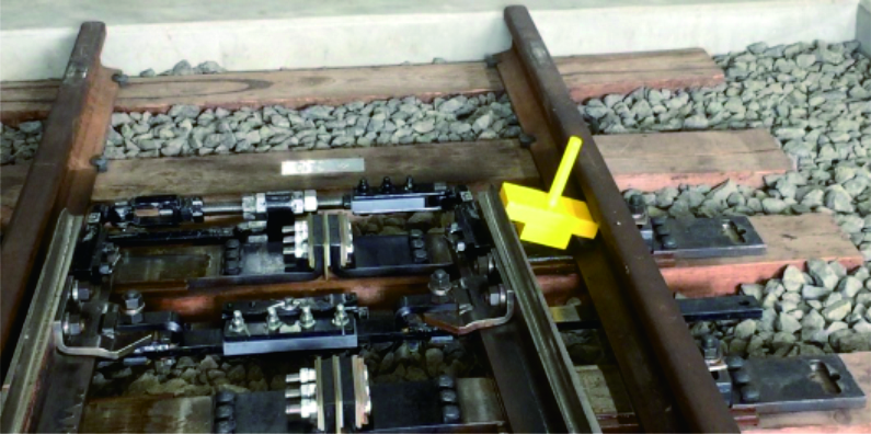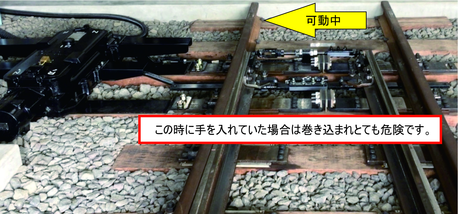可動ポイントの危険域に物理的ストッパーで挟み事故リスクを低減